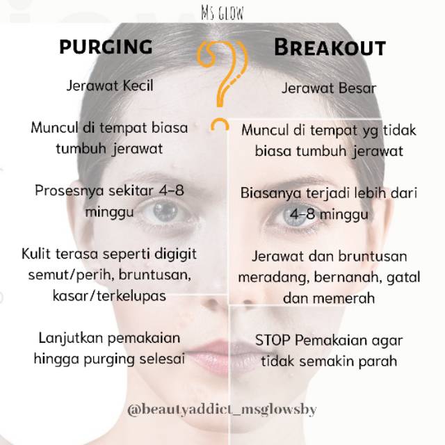 Jadi kulit masih menyesuaikan diri dengan skincare baru. Namun, saat dilajutkan ke step 2, reaksi negatif cenderung berhenti. Padahal setiap produk skincare akan memberikan reaksi. Dibawah ini adalah sebuah reaksi yang sangat umum terjadi apabila awal pemakaian cream ms glow. Hal ini tergantung dari jenis produk yang anda gunakan maupun kondisi wajah penggunanya.